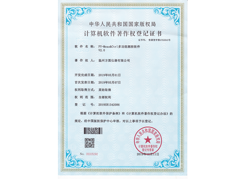 中華人民共和國國家版權局 計算機軟件著作權登記證書:FY-Meas&Ctrl多功能測控軟件V2.0(軟著登字第4762843號)