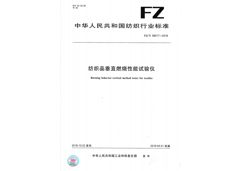 參與起草《紡織品垂直燃燒性能試驗儀》(FZ/T 98017-2018),該標準由中華人民共和國工業(yè)和信息化部于 2018-10-22 發(fā)布